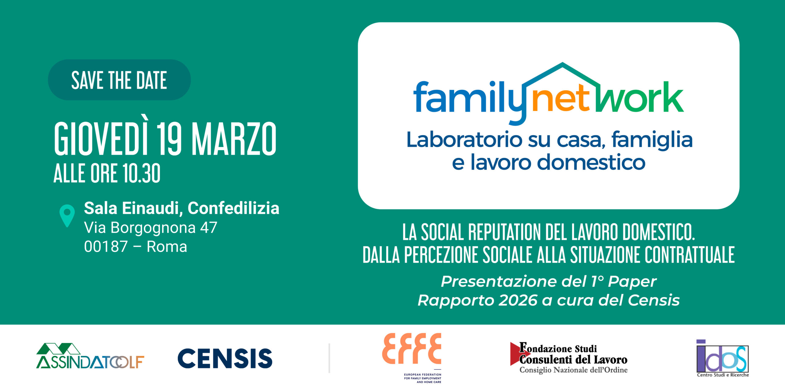 Presentazione del 1° Paper Rapporto 2026 “Family (Net) Work – Laboratorio su casa, famiglia e lavoro domestico”, a cura del Censis, dal titolo: “La social reputation del lavoro domestico. Dalla percezione sociale alla situazione contrattuale“.