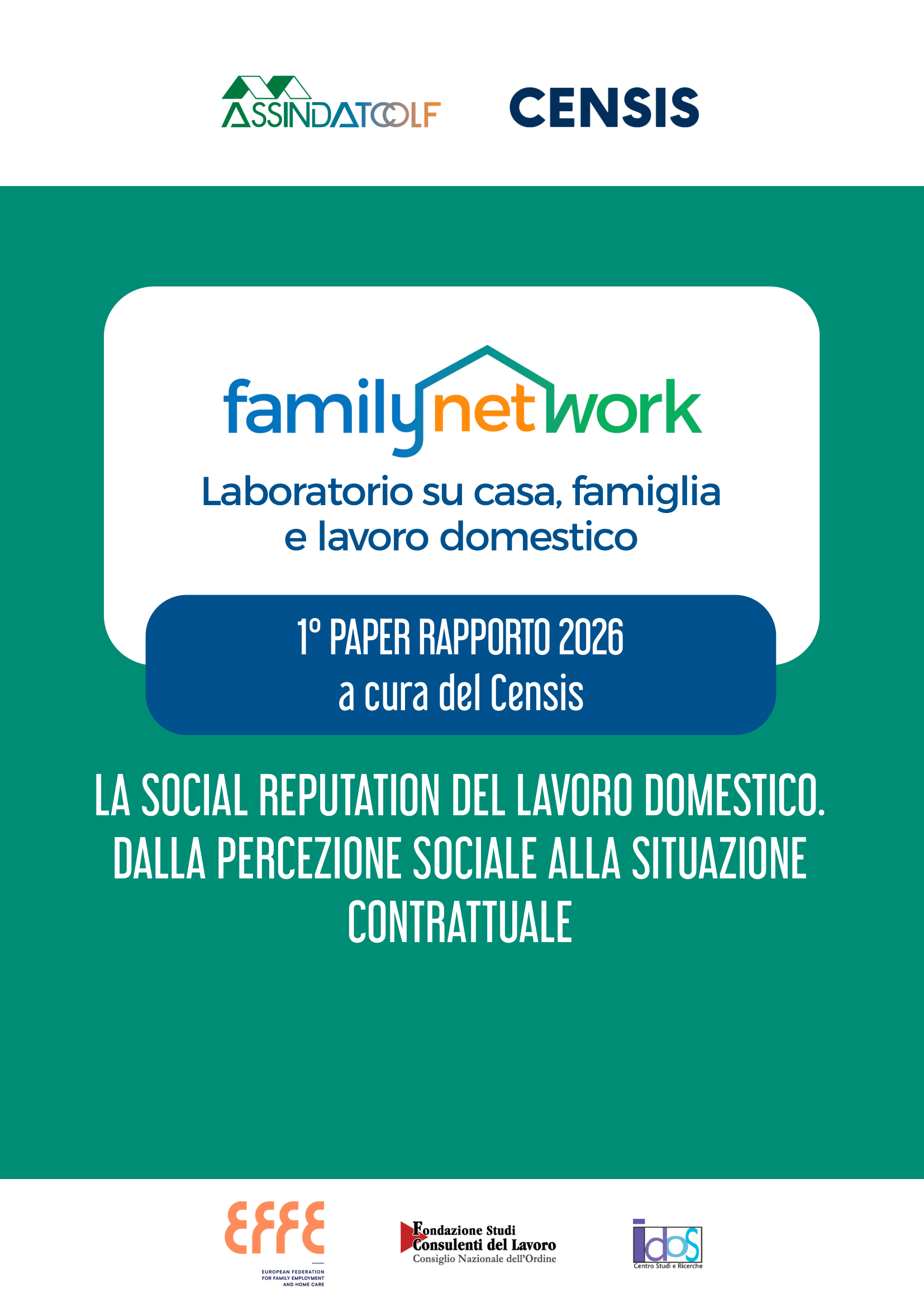 Il primo paper Family (Net) Work del 2026 è il risultato di due analisi sul lavoro domestico in Italia parallele, realizzate dal Censis. Da un lato, per avere una visione della percezione del lavoro domestico da parte degli italiani, si è scelto di effettuare una rilevazione su un campione rappresentativo della popolazione adulta e di delineare, attraverso le risposte raccolte, la reputazione sociale del lavoro domestico. Dall’altro lato, le analisi hanno orientato la riflessione sulla ricostruzione degli assetti contrattuali del settore, utilizzando il vasto bagaglio informativo presente all’interno del database del Network e proveniente dalle comunicazioni amministrative che gli associati Assindatcolf, Webcolf, Acli in famiglia e Gestisci la tua Colf trasmettono alle associazioni.